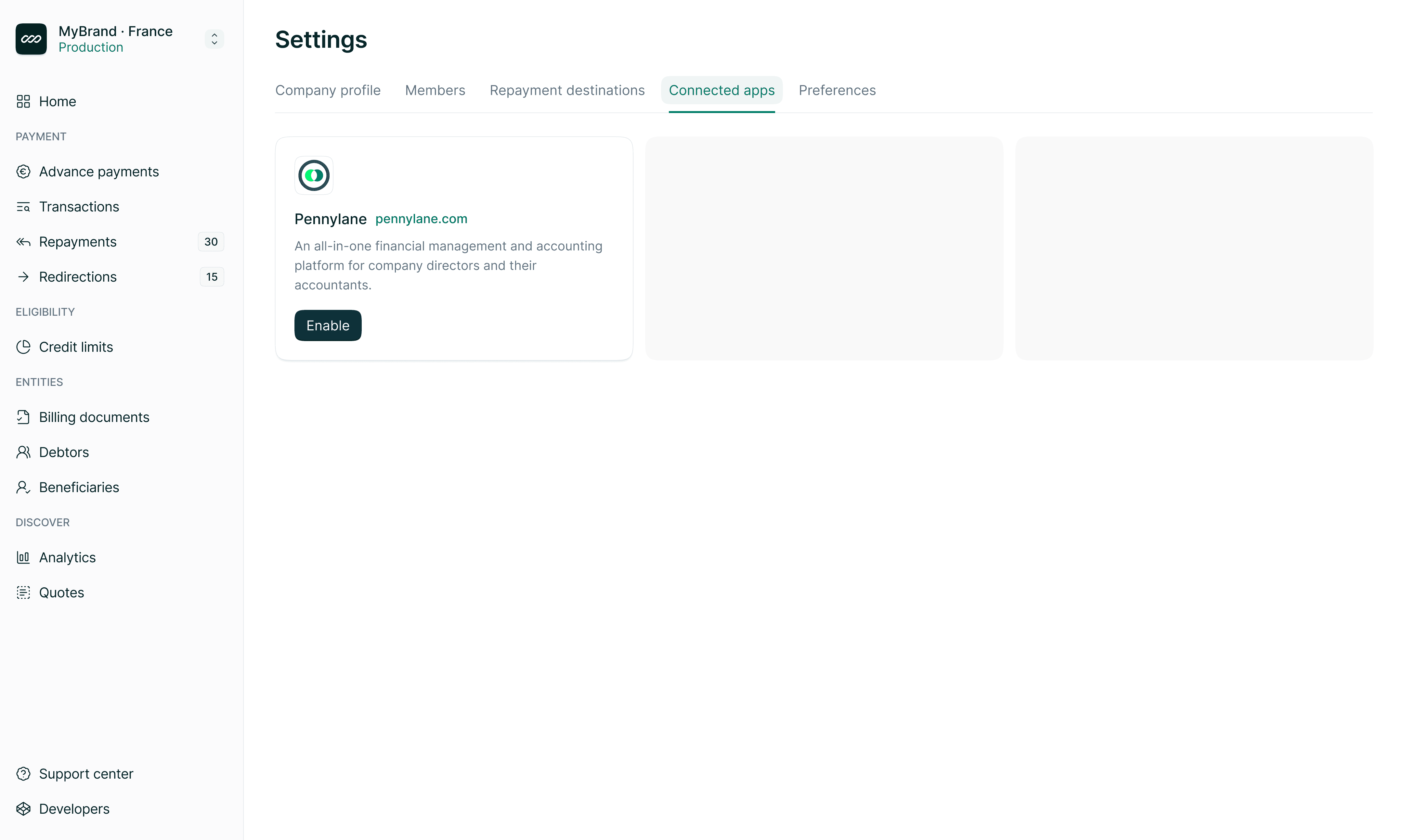 The dashboard is an entry point to this service. It allows our clients, including operations teams, developers, and CFOs, to track transactions, view logs, manage loans and invoices, and test our API.